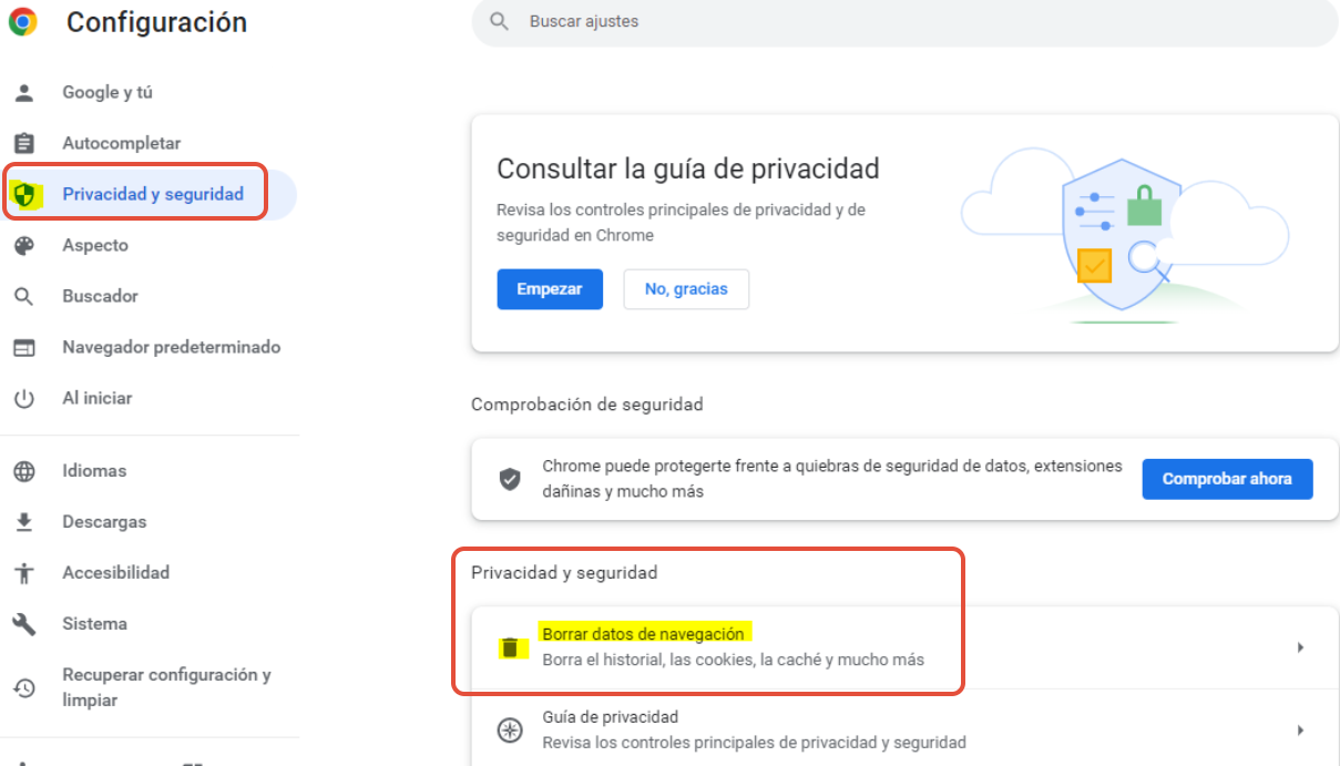 2. Selecciona el apartado de "Privacidad y seguridad" y luego "Borrar datos de navegación en la opciones desplegadas.